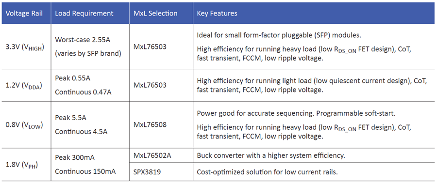 - Direct step-down from a 12V input to 0.8V is achieved using the MxL76508 buck converter. For 3.3V and 1.2V rails, multiple MxL76503 or MxL76502 converters can be deployed, each configured for its target voltage.