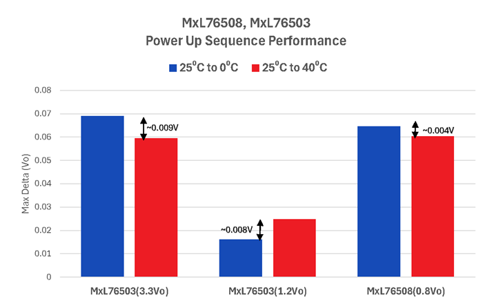 The power-up sequence implemented using the MxL76508 and MxL76503 devices was tested across ambient temperatures ranging from 0 °C to 40 °C, in accordance with commercial standards. With a maximum delta difference of 0.07V, the system consistently delivered stable and predictable power-up sequence performance, demonstrating excellent thermal stability. These results underscore the robustness and reliability of the power design, ensuring dependable operation across a wide range of environmental conditions.