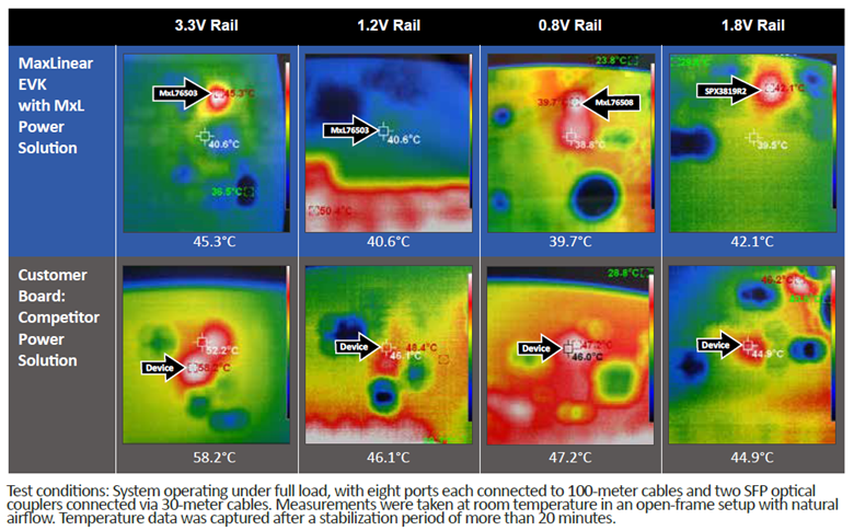 - Significantly reduce hot spots across the board with the MxL76508, MxL76503, and MxL76502* distributed converters compared to single PMIC devices, eliminating the need for thermal management with heat sinks and airflow zone control.