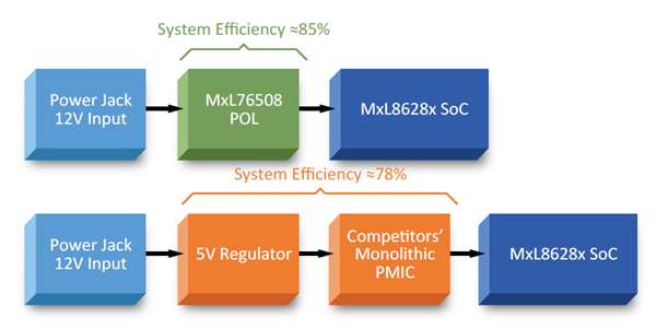 Delivering high efficiency, a compact design, robust thermal performance with minimal noise, the MxL7650x devices simplify power architecture, particularly for direct conversion of a 12V input to multiple rails such as 3.3V, 1.8V, 1.2V, and 0.8V.