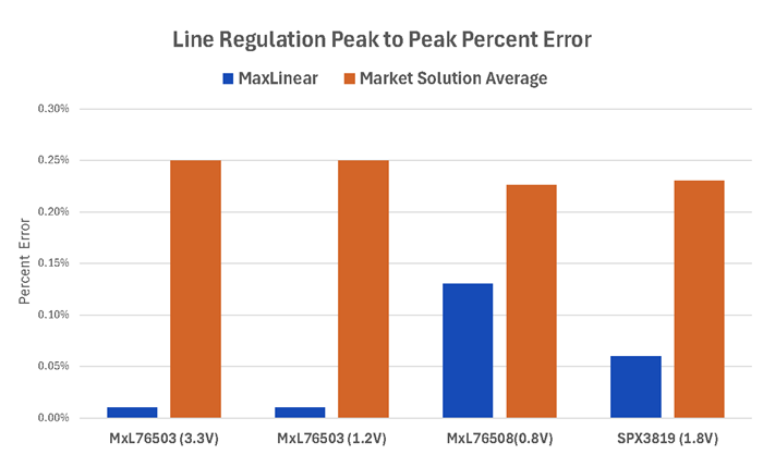 The following figures show onboard test results using the MxL76508 for the 0.8V rail, MxL76503 for the 3.3V and 1.2V rails, and SPX3819 for the 1.8V rail. Line regulation was tested under input voltage variations of ±10%, while load regulation was tested from 0A up to the maximum SoC load requirements. This data compares MaxLinear's performance against the average results of market competitors and shows that Maxlinear's power solution provides superior line and load regulation performance.