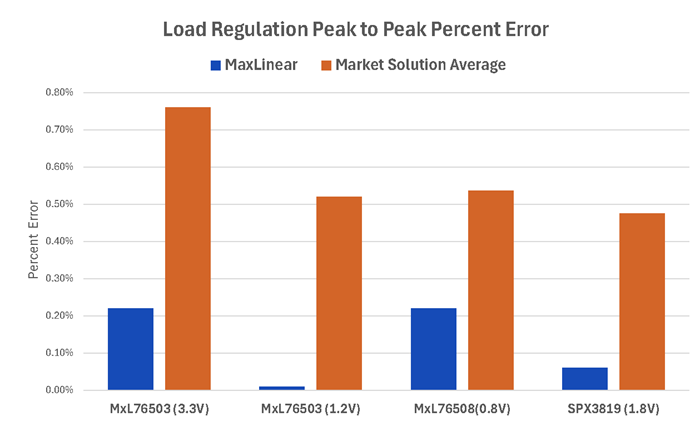 The following figures show onboard test results using the MxL76508 for the 0.8V rail, MxL76503 for the 3.3V and 1.2V rails, and SPX3819 for the 1.8V rail. Line regulation was tested under input voltage variations of ±10%, while load regulation was tested from 0A up to the maximum SoC load requirements. This data compares MaxLinear's performance against the average results of market competitors and shows that Maxlinear's power solution provides superior line and load regulation performance.