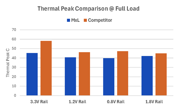 - Significantly reduce hot spots across the board with the MxL76508, MxL76503, and MxL76502* distributed converters compared to single PMIC devices, eliminating the need for thermal management with heat sinks and airflow zone control.