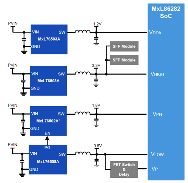 The power architecture solution is proudly featured in the MxL86282S Ethernet switch SoC as a reference platform, which requires 3.3V, 1.8V*, 1.2V, and 0.8V rails, fast transient response, and a compact layout. Each MxL7650x rail contributes to a cohesive, high-efficient power tree solution that enables the MxL86282S to meet the demanding and volatile network traffic needs. For more information, refer to the MxL86282S Data Sheet.