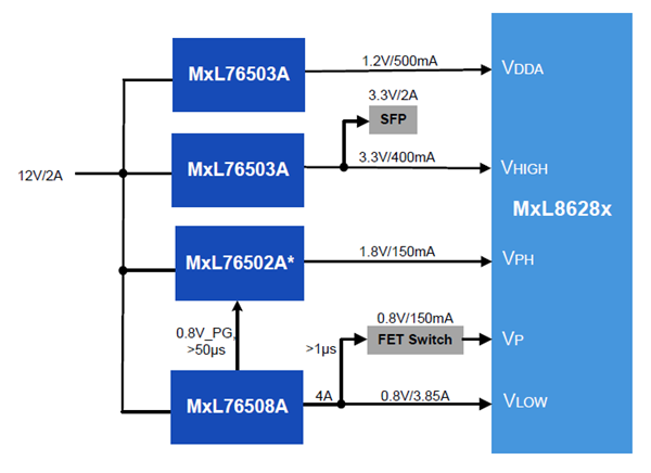 - Direct step-down from a 12V input to 0.8V is achieved using the MxL76508 buck converter. For 3.3V and 1.2V rails, multiple MxL76503 or MxL76502 converters can be deployed, each configured for its target voltage.