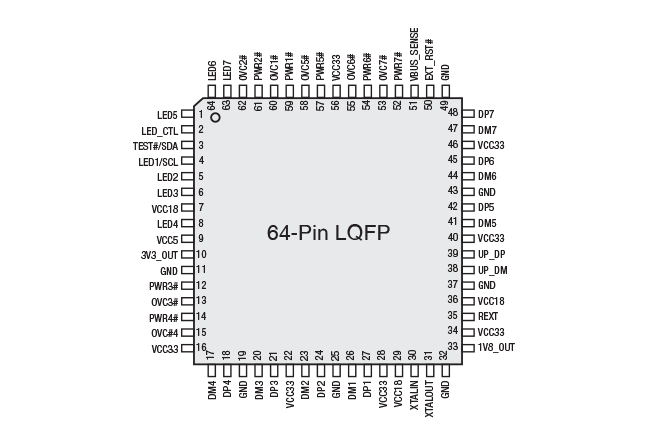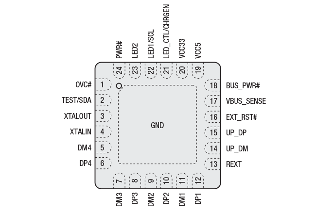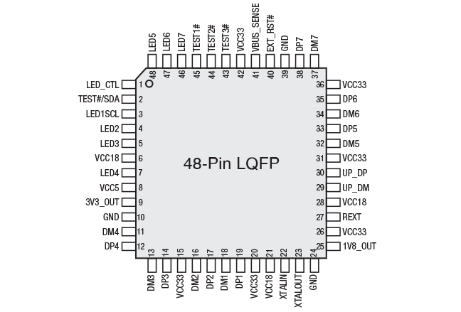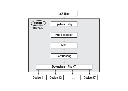 The XR22417 is a USB 2.0, 7-port hub using Multiple Transaction Translators (MTT) for highest possible bandwidth capability.