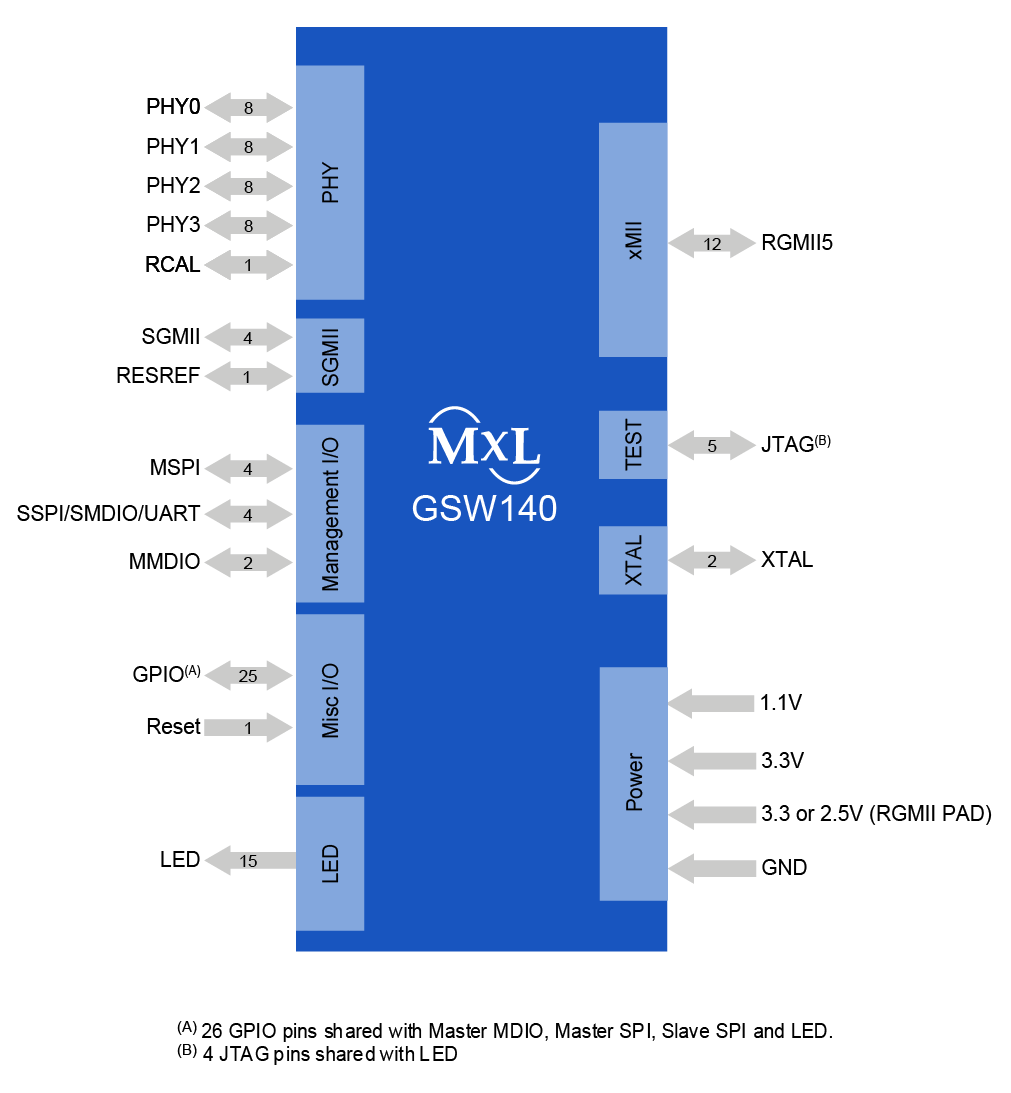 The GSW140 devices are configurable via pin-strapping, by means of the MDIO interface, UART interface, SPI interface or optionally by connecting an external EEPROM. Integrated QoS technology prioritizes switch traffic for different classes of applications e.g. VoIP, video, audio and data based on port ID, 802.1p, IP DSCP/ToS and multiple fields of the packet. IEEE 1588v2 support enables highly accurate precision timing protocol applications. The 1 M Bits embedded packet storage SRAM is integrated with 9 KB jumbo frame support.