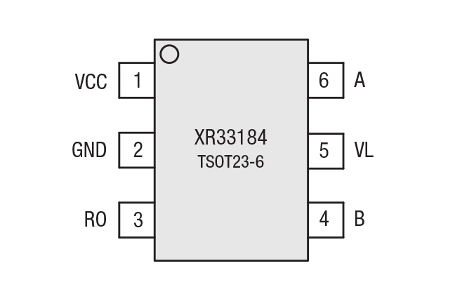 The XR3318x offers several pinout options to maximize performance in different applications while maintaining a minimum pin count. The XR33180 is available in a 5-pin TSOT23 package with the receiver always enabled. The XR33181 is available in a 6-pin TSOT23 package and offers an active high receiver enable pin while the XR33183 has the same pinout but with active low enable pin. The XR33184 is available in a 6-pin TSOT23 package with an I/O logic supply pin to ease the interface to MCU’s or FPGA’s that run off of different supply voltages. The VL supply pin allows the XR33184 to interface to other devices running off of supplies from ranging from 1.65V to VCC.